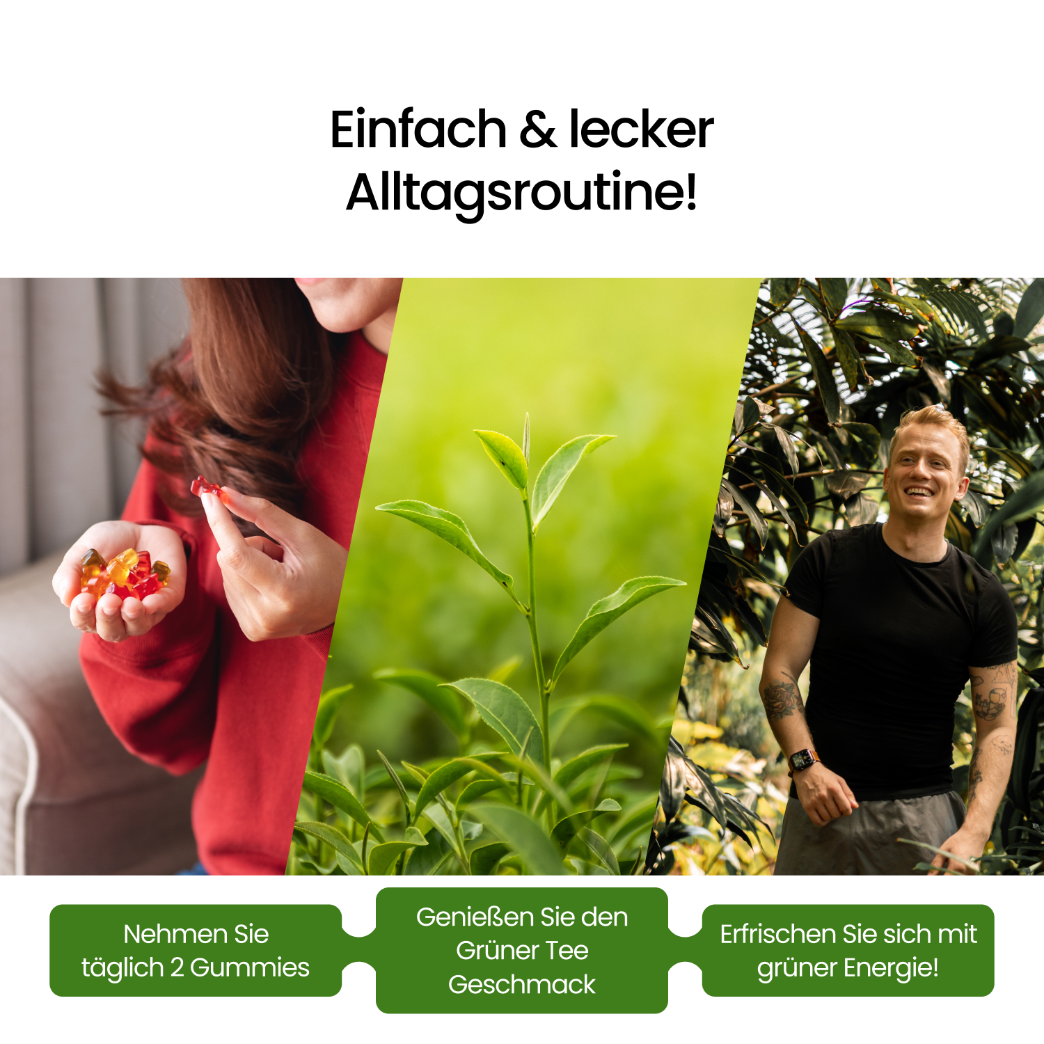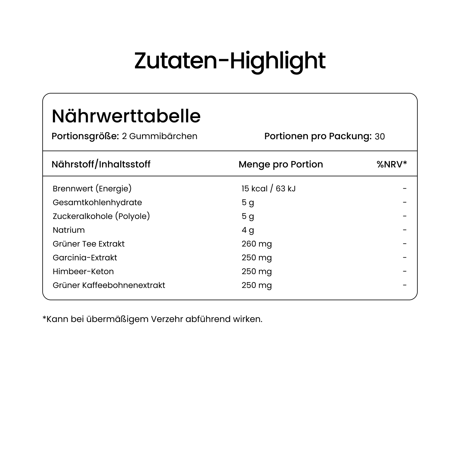 Contains a 1010 mg blend per daily serving (2 gummies), including green tea extract, garcinia extract, raspberry ketone, and green coffee bean extract for a well-rounded formula.
